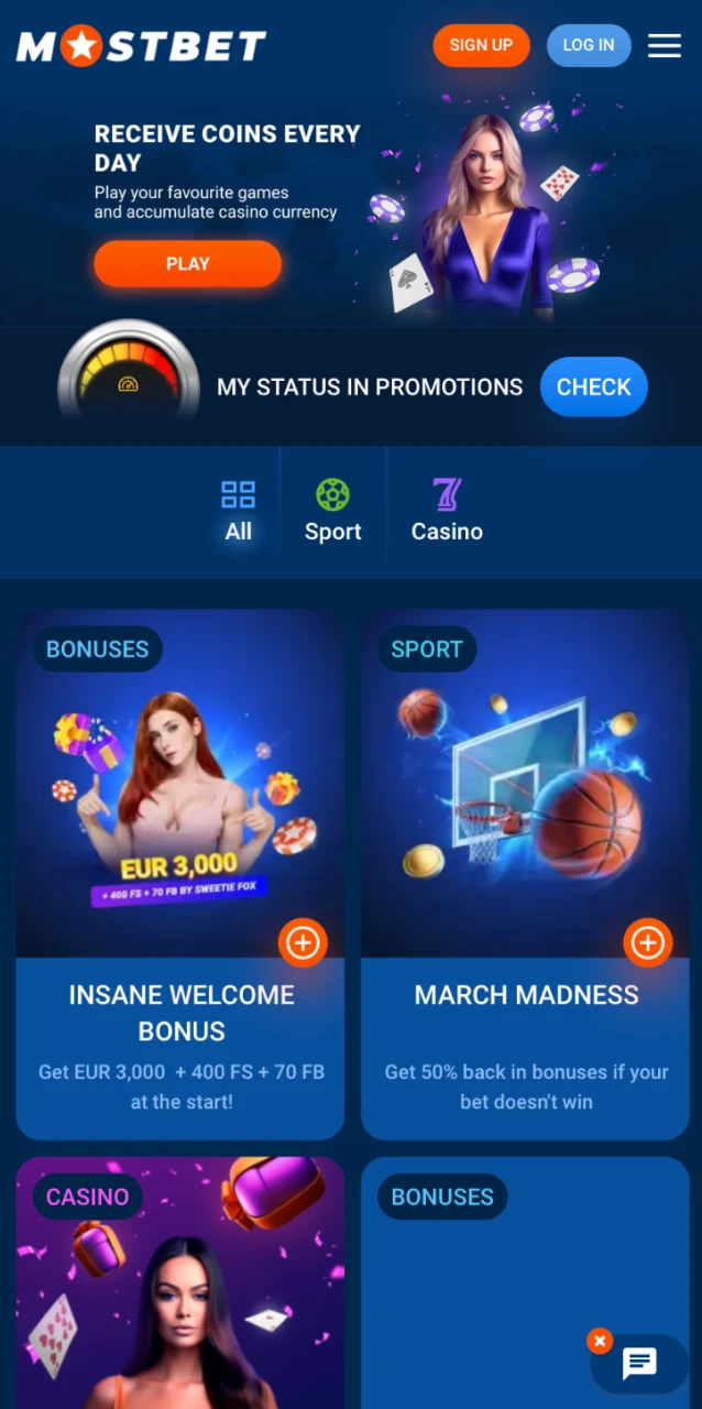 New users of the Mostbet mobile app can claim a welcome bonus on the first deposit and choose between a sports or casino offer.